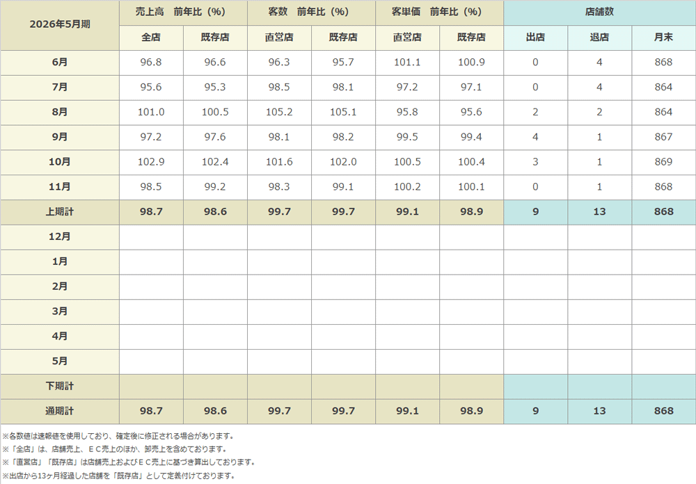 当月の売上高は全店で前年比 9 8 . 5%、既存店で前年比 9 9 . 2%となりました。累計では、全店で前年比 9 8 . 7%、既存店で前年比 9 8 . 6%となりました。